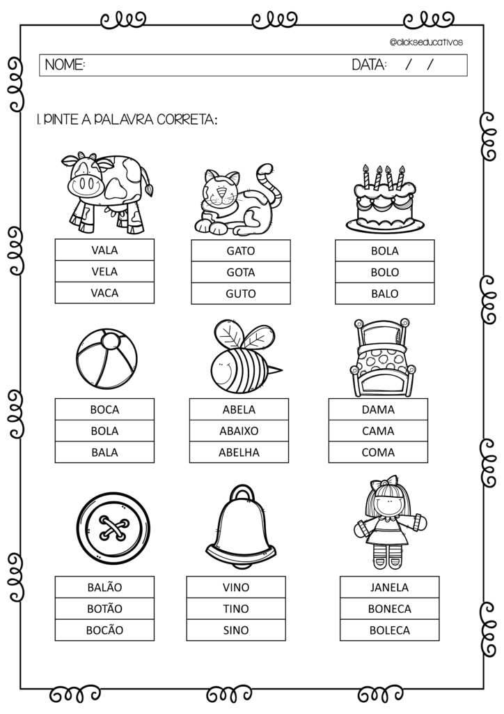 Nesta atividade de alfabetização leitura e escrita para 2º ano você irá trabalhar com sua turma o pinta palavras, sendo que, a criança irá observar o desenho e pintar a palavra correta correspondente.