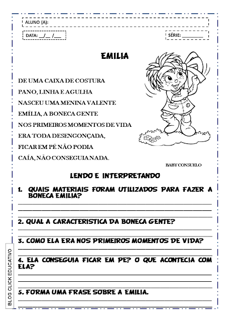 Atividade de interpretação de texto para imprimir: Emília