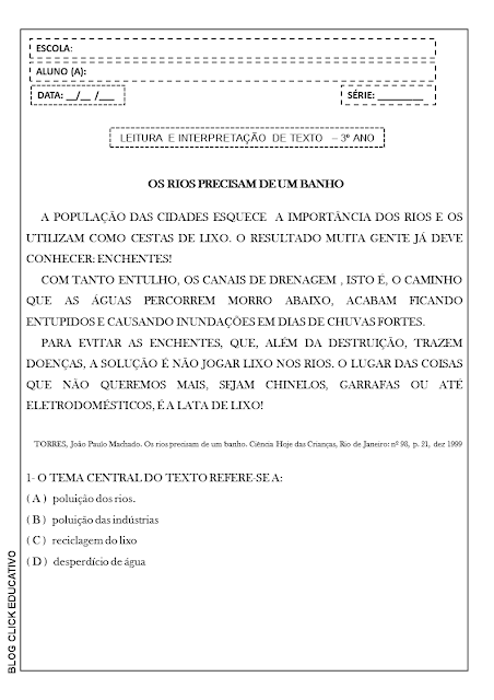 Dia da água: Atividade para 3º ano para imprimir