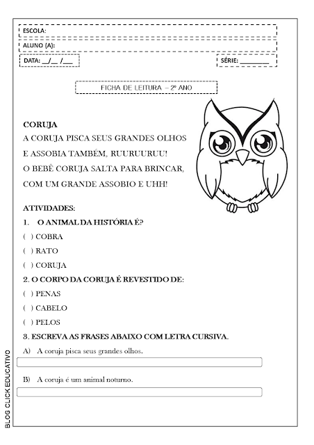 Ficha de Leitura com plano de aula para alfabetização: Coruja