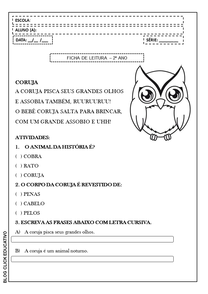 Ficha de Leitura com plano de aula para alfabetização: Coruja