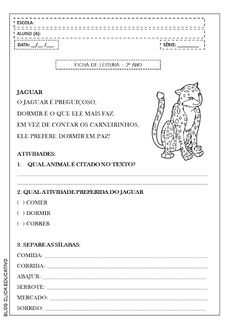 Ficha de leitura e interpretação de texto pra 2º ano: Jaguar