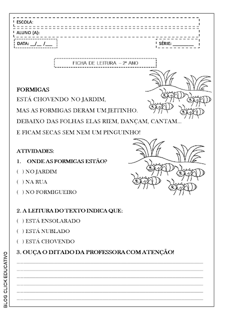 Ficha de leitura para segundo ano: Formigas para imprimir e colorir