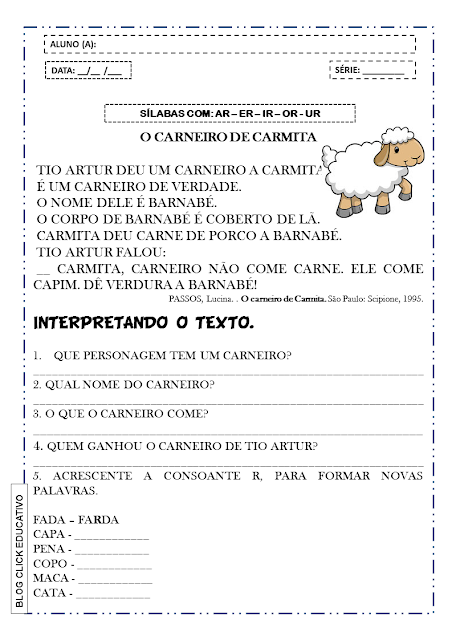 Atividade de Leitura e interpretação de texto 3º Ano: O carneiro de Carmita