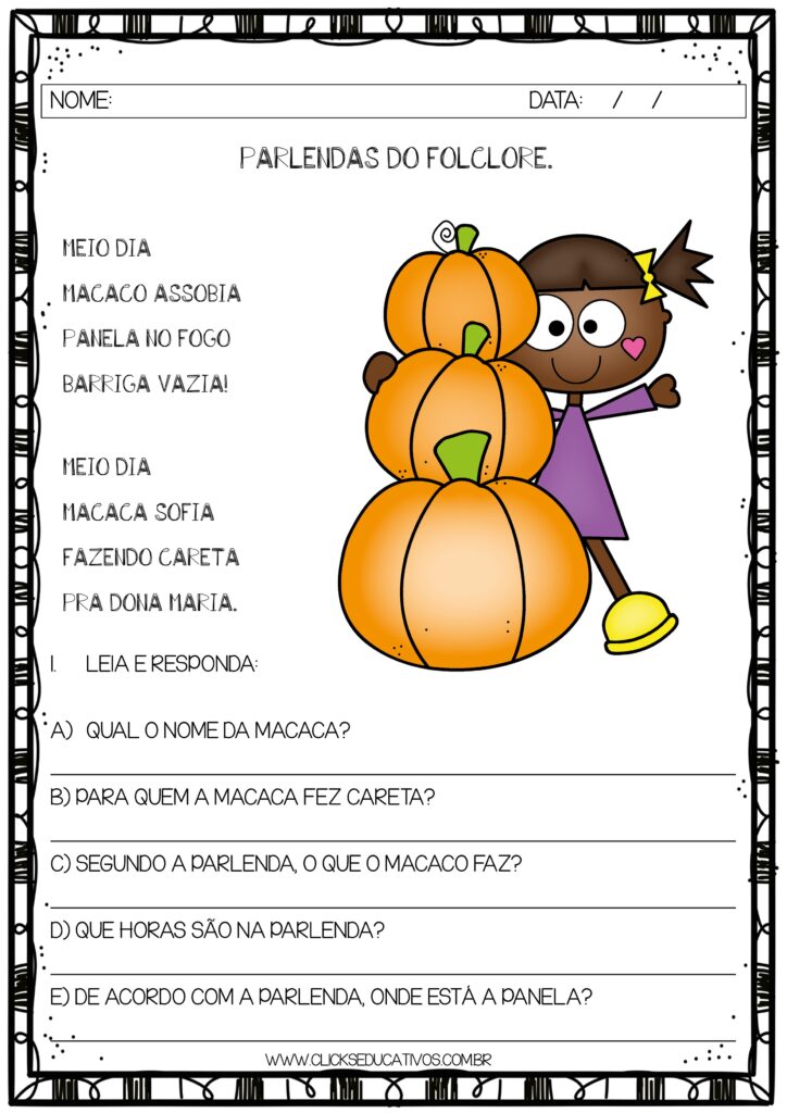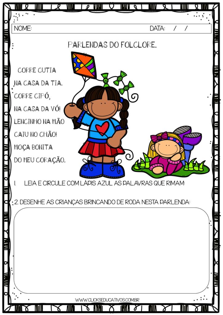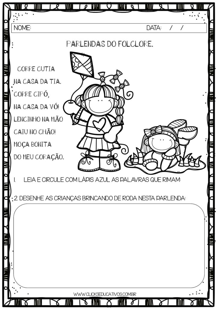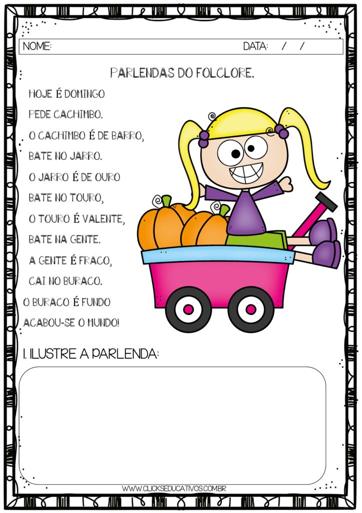 O mês de agosto chegou e, com ele as atividades são buscadas com mais frequência para o trabalho em classe. Portanto, o trabalho sobre o folclore aqui abordado retrata parlendas, um total de seis folhas para imprimir e usar como quiser com sua classe.