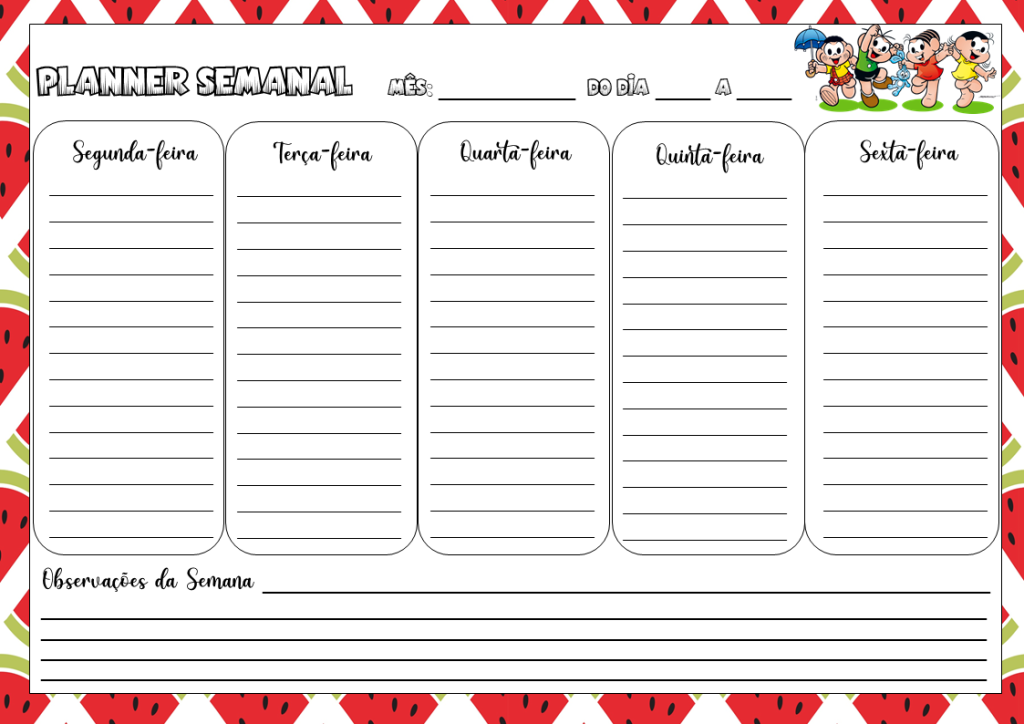 Fico muito feliz em anunciar que agora você pode baixar a versão do Planner Escolar Turma da Mônica que foi pensado para os dias úteis escolares de segunda a sexta-feira.