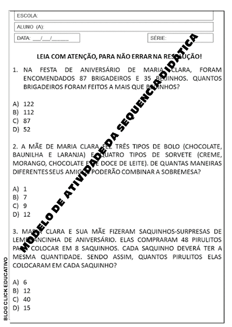PLANO DE AULA 3º ANO: SEQUÊNCIA DIDÁTICA DE MATEMÁTICA COM SITUAÇÕES PROBLEMAS