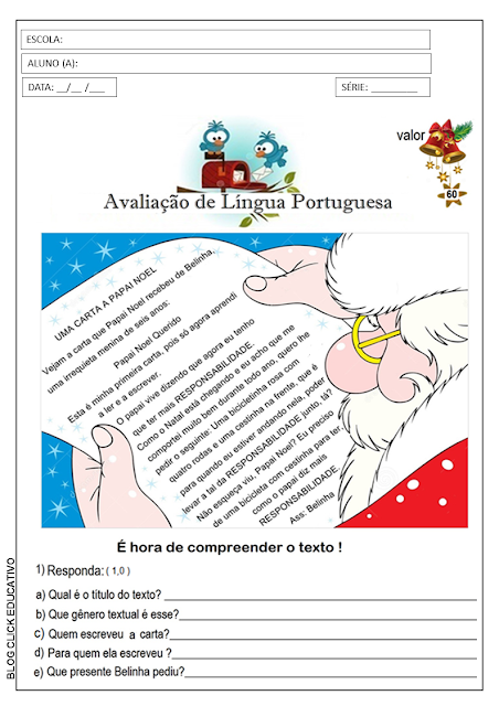 ALFABETIZADORA A MUITOS ANOS, ELA NOS ENVIOU ESTA COLABORAÇÃO DE AVALIAÇÃO DE LÍNGUA PORTUGUESA COM TEMA NATALINO.