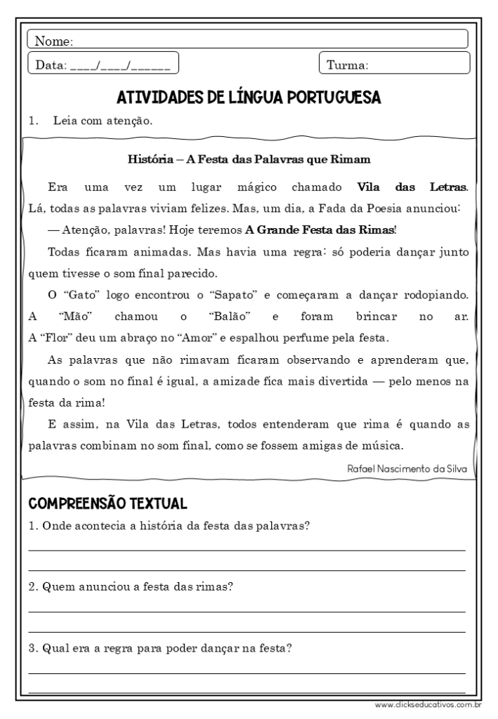 Trabalhar rimas no 2º ano é muito mais do que ensinar um recurso poético: é uma maneira de reforçar a alfabetização, ampliar o vocabulário e despertar o prazer pela leitura. Quando o professor alia explicações claras a atividades criativas, as crianças aprendem de forma natural, divertida e duradoura.